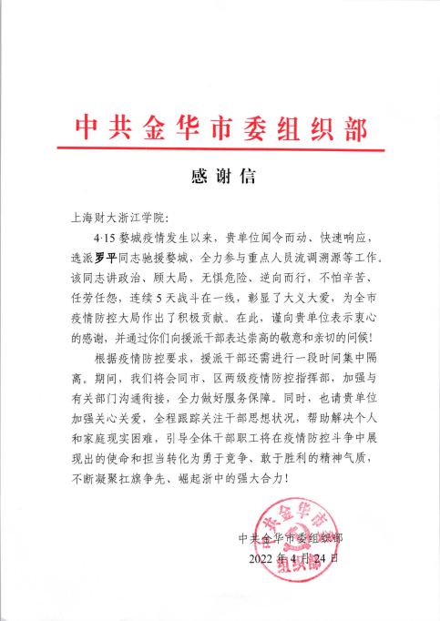 “罗平同志讲政治、顾大局,无惧危险、逆向而行,不怕辛苦、任劳任怨,连续5天战斗在一线,彰显了大义大爱,为全市疫情防控大局作出了积极贡献……”近日,我院收到了一封来自中共金华市委组织部发来的感谢信,对我院教工党员罗平老师在“4.15”婺城疫情防控期间付出的努力表示感谢。