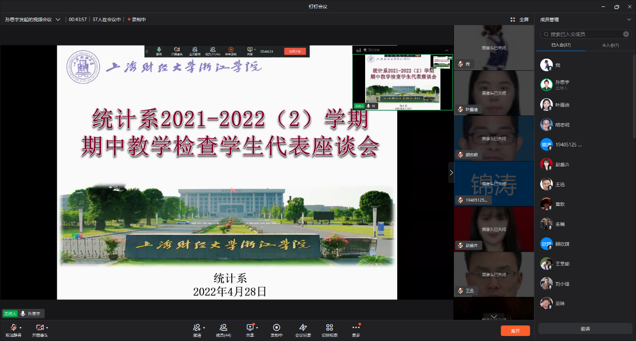 为进一步提高我系教学生活管理工作水平,推动系发展,我系于4月28日中午12:40在钉钉会议组织召开了2021-2022学年第二学期期中教学检查学生代表座谈会。统计系19-21级各班班长和信息员、教务处王迅老师及统计系全体教师出席了此次会议。